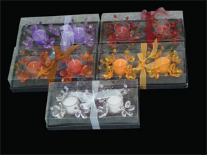 Стеклянный прозрачный Подсвечник арт. TLV231 со свечой внутри. Свеча и декор в одном цвете. Цветы из прозрачного акрила и натуральных тканей. Набор из двух свечей оформлен в пластиковую коробку на бумажной подставке.