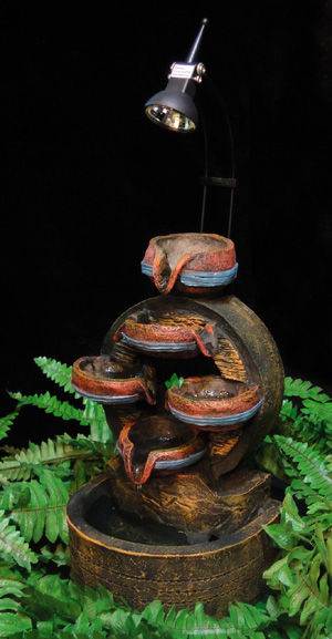 Настольный декоративный фонтан с верхней подсветкой высотой 35 см изготовлен из полистоуна. Композиция фонтана представлена в виде каскада из старинных цветных чаш. Пять потоков воды из этих чаш собираются внизу в небольшой водоем. Это приятный и полезный подарок друзьям и близким. Он украсит интерьер помещения, увлажнит воздух в комнате.