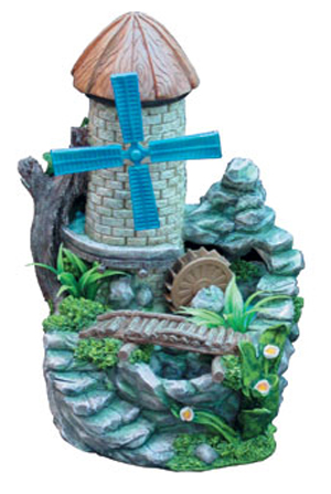 Фонтан из серии Фонтаны Домики, высота 28 см. Фонтан напоминает мельницу на горе. При включении фонтана поток воды напоминает, как-будто ров вдоль башни наполнен водой и из него вода попадает на колесо, что придает ему вращение. Мельница с красивым пейзажем послужит прекрасным подарком для загородного интерьера. Фонтан изготовлен из полистоуна и укомплектован помпой.